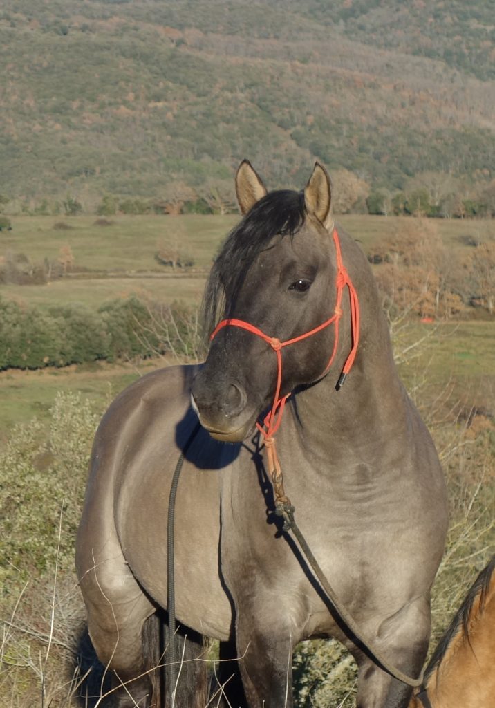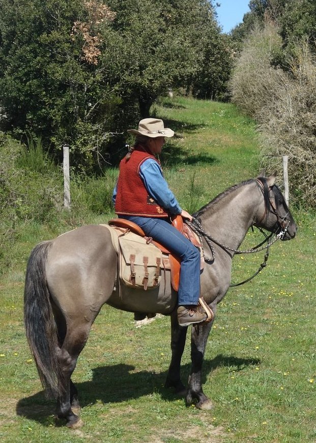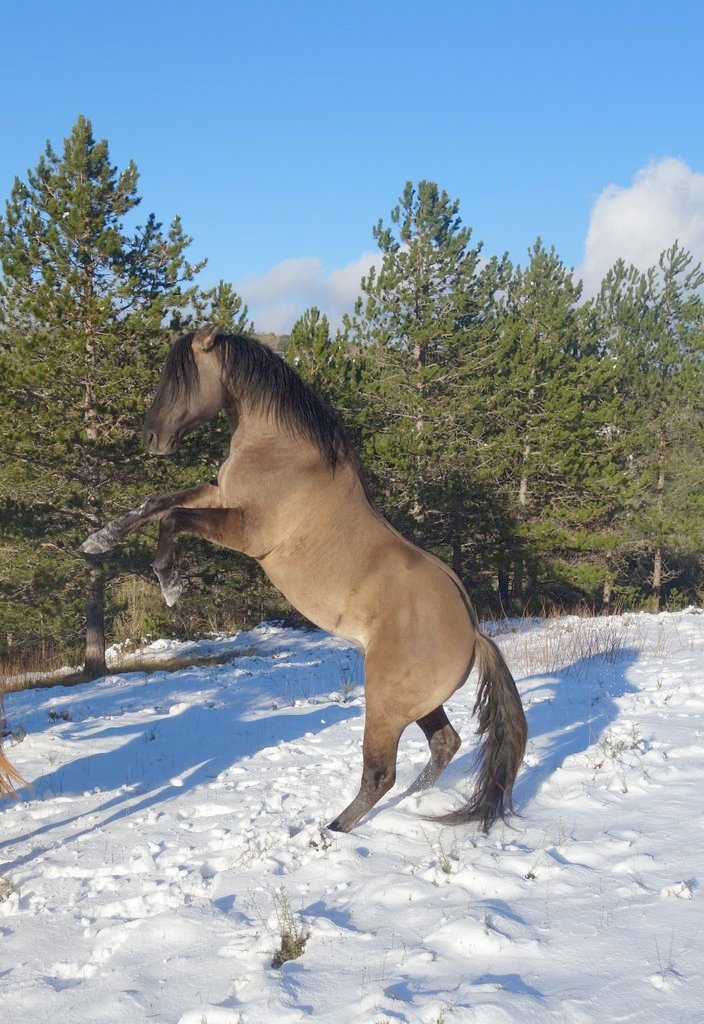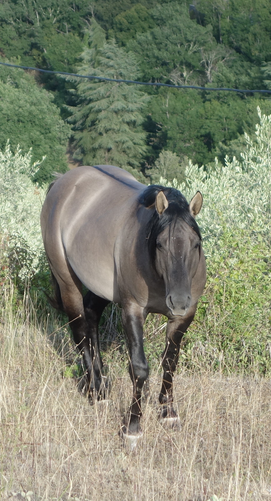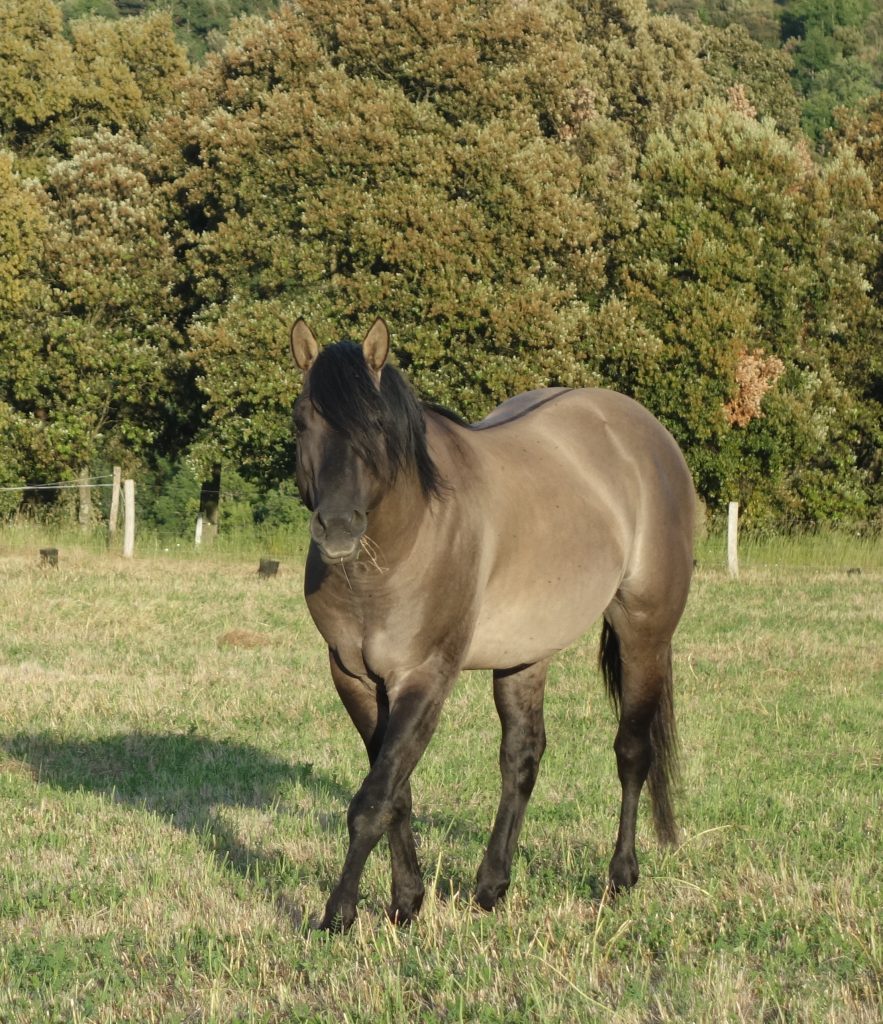 TG MOONWALKER, magnifique étalon Quarter Horse, 100% Fondation NFQHA, Grullo, né en 2016, arrivé chez nous en 2019. Très beau modèle typé RANCH, « No marking », mental exceptionnel. Homozygote DUN. Il vit avec une jument , au pré. Il est aussi monté et très agréable sous la selle avec nous, avec de très beaux moments de partage en extérieur et en travail sur le plat.